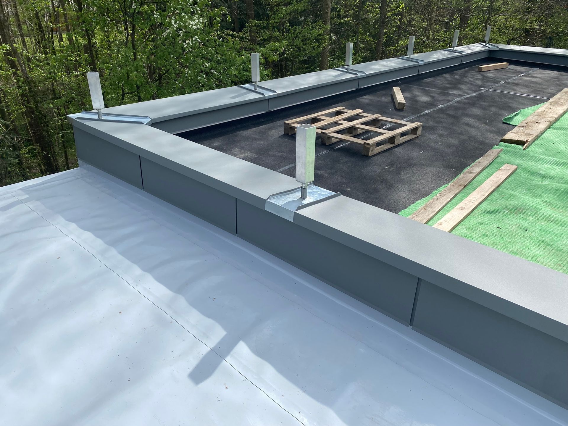 Flachdach mit Begrünung samt Zaunstützeneinfassung auf der Attika
